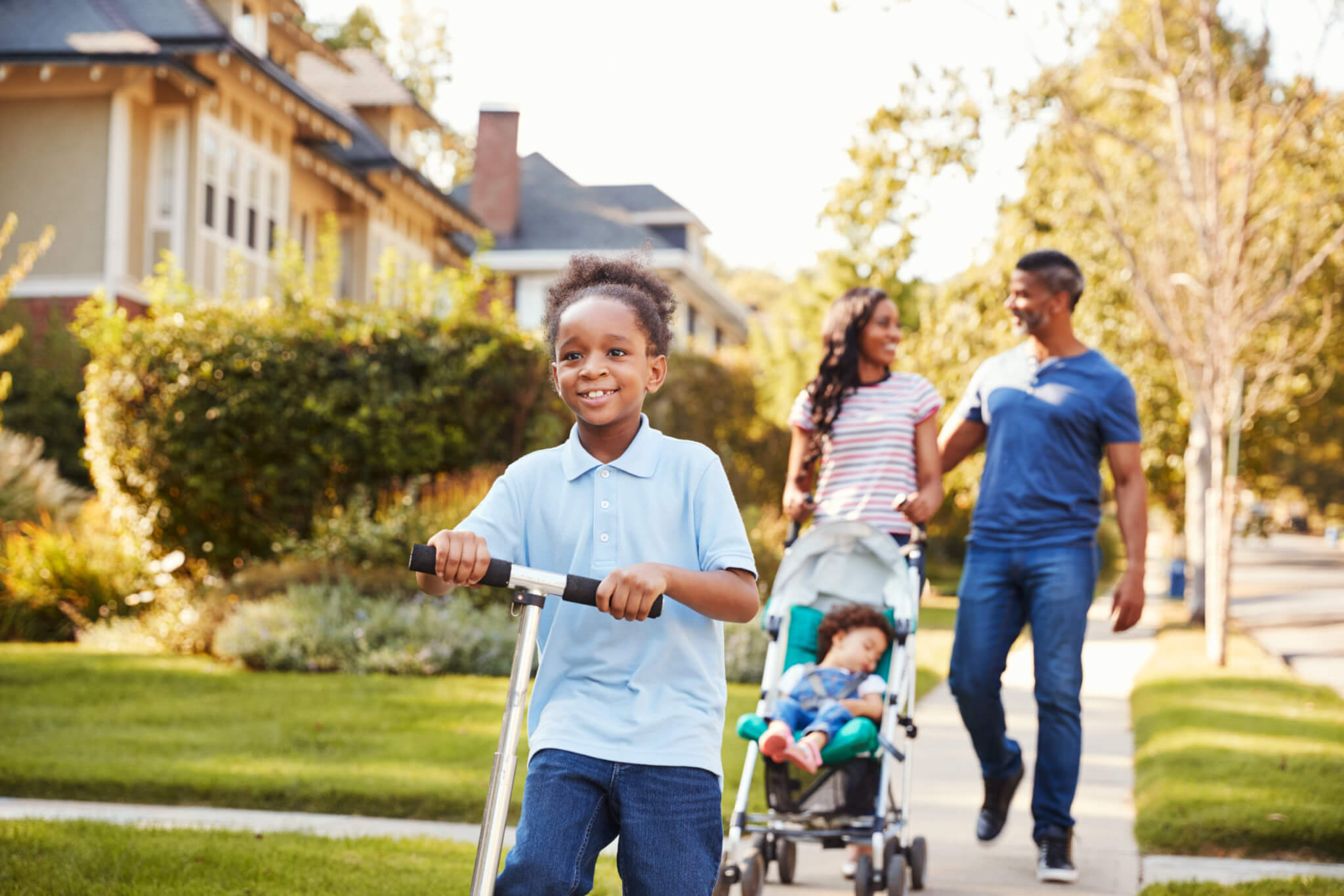 Couple,Push,Daughter,In,Stroller,As,Son,Rides,Scooter