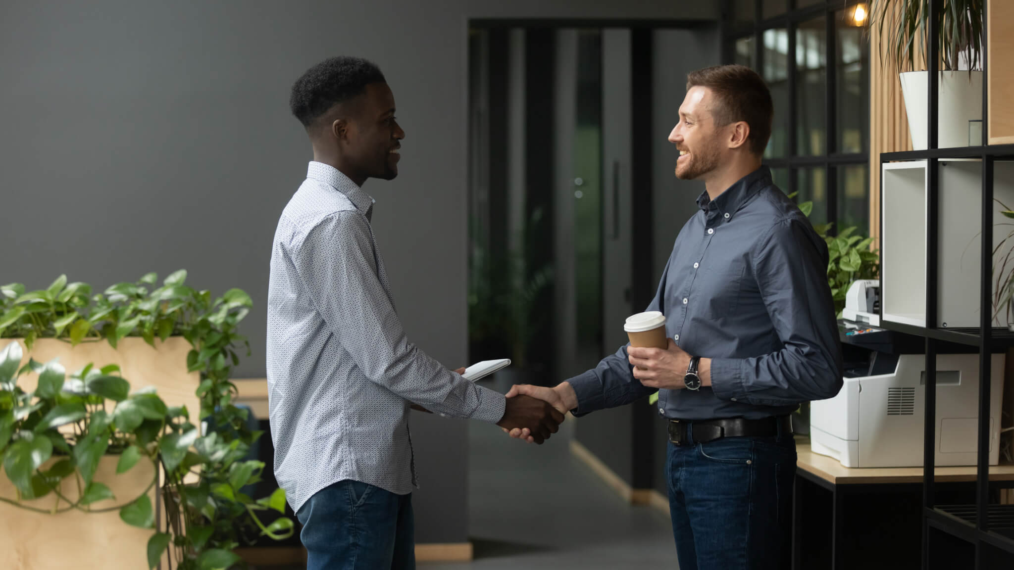 African and caucasian ethnicity colleagues greet together shaking hands