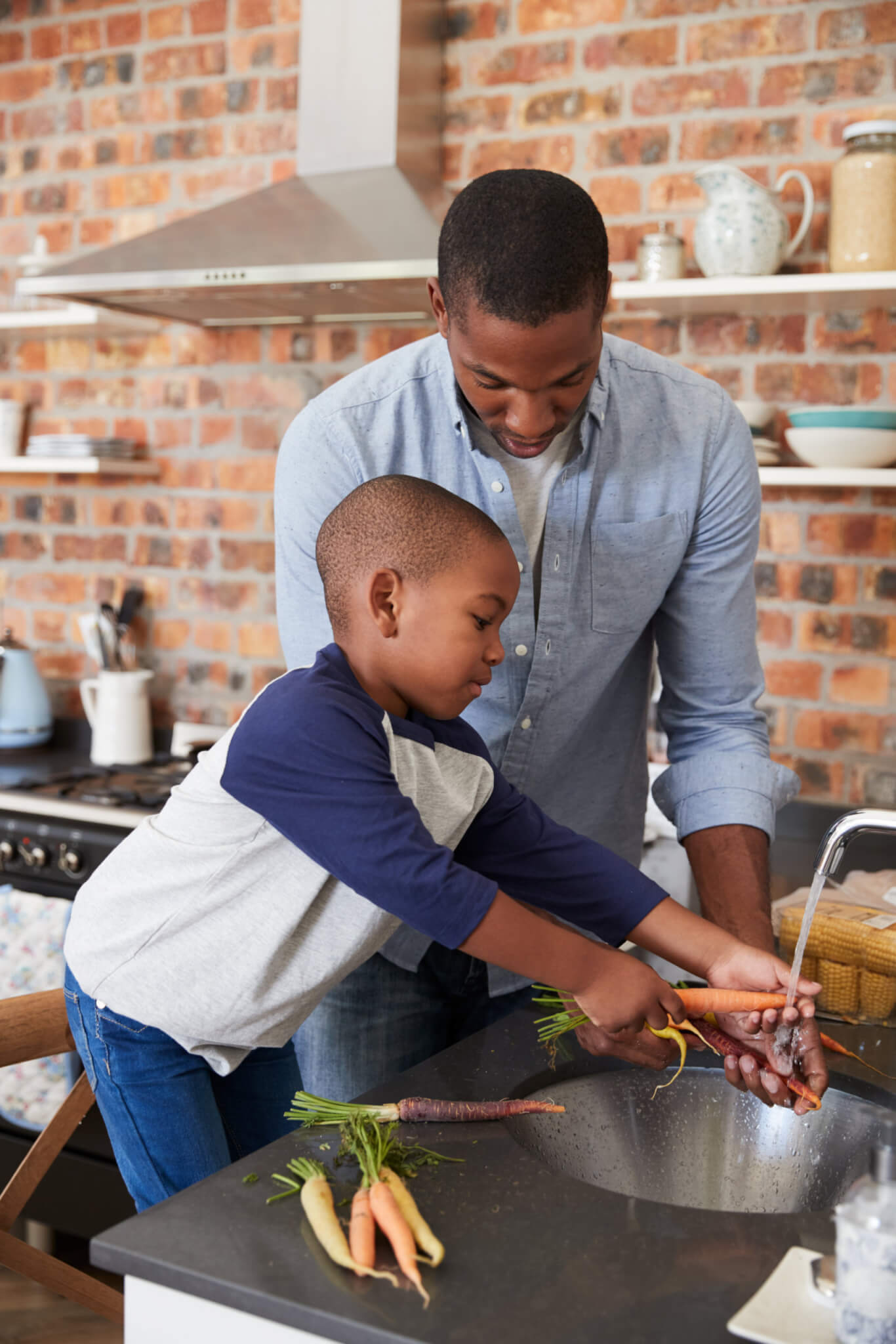 Son,Helping,Father,To,Prepare,Vegetables,For,Meal,In,Kitchen